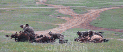 -Баярлалаа. АХ-ын 93 жилийн ой, үндэсний баяр наадамдаа зориулж бид долдугаар сарын 10-наас эхлэн 12-ныг дуустал өдөр бүр хоёр тоглолт хийлээ. Морьд гарааны зурхай руу хөдөлж, барианд орох хүртэл бас ч багагүй хугацаа зарцуулагддаг шүү дээ. Энэ хооронд үзэгчдийг уйдаахгүй байх үүднээс манай БХТН-ийн Техник спорт төвийн морин спортын тамирчин найман хүн, Хил хамгаалах байгууллагын Морин бэлтгэлийн 10 тамирчин хоёр дасгалжуулагчийн хамтаар морин дээрх төрөл бүрийн үзүүлбэрүүдийг үзүүлдэг. Өөрөөр хэлбэл, манай БХТН-ийн Техник спорт төвийн морин спортын тамирчид саадан дээгүүр нэгээр харайх, хоёр хосоор харайх, гурван хосоор харайх зэрэг саад харайлтын үзүүлбэрийг үзүүлэхээс гадна, морины ёсолгоогоор үзэгчдээ хөгжөөдөг. Мөн илүү сонирхолтой болгох үүднээс саадаа өндөрлөж харайх үзүүлбэрүүдийг хийж байгаа. Харин Хил хамгаалах байгууллагын Морин бэлтгэлийн төвийн тамирчид морин дээрээ зогсоо байдлаар ард түмэнтэйгээ мэндчлэх, морины давхиан дунд бургас цавчих, саад харайх, морин дээрээс чирэгдэх, юм шүүрэх гэх мэтчилэнгийн циркийн жанрын үзүүлбэрүүдийг үзүүлсэн.